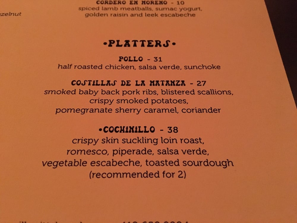 Crispy skin suckling pork roast, country style sausage, romesco, piperade, salsa verde, roasted pepper conserva and patatas bravas. (Recommended for 4 people).
